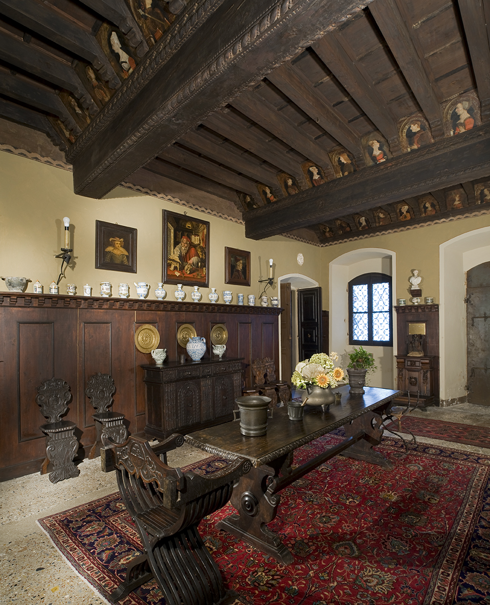 Ein Tafelbild auf der Wand gegenüber dem Kamin aufgehängt zeigt St. Jerome in seiner Studie. Das ist ein Werke der Cremonese Maler Giovanni Andrea Secchi aus dem Jahr 1536.