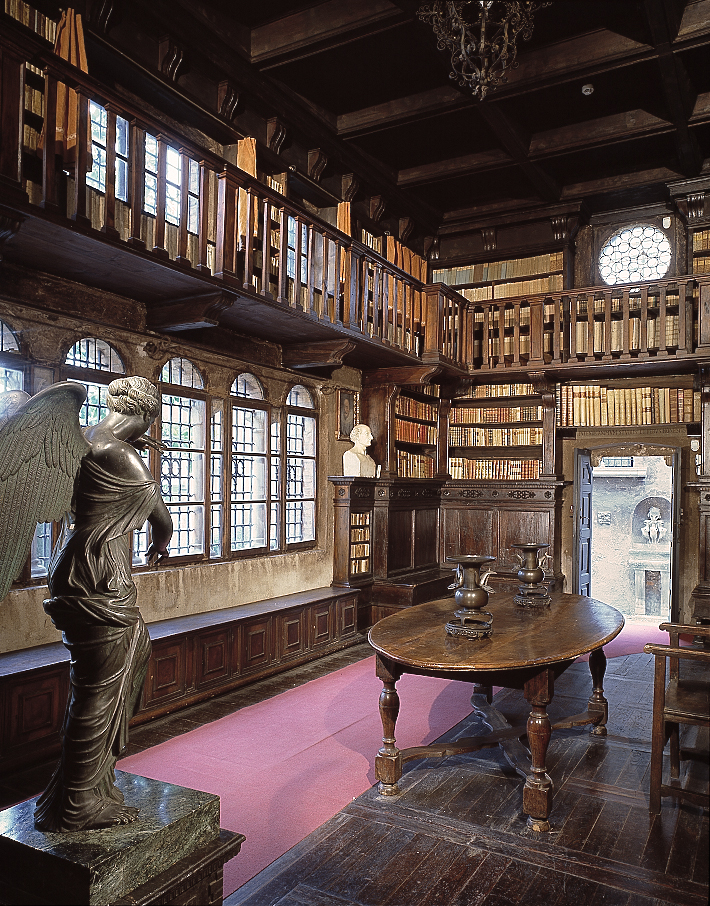Die Einrichtung dieses Saals ist besonders in Bezug auf Möbel überlegt: in der unterer Abschnitt besteht aus einem ehemaligen Klosterchor aus dem siebzehnten Jahrhundert, die Kassettendecke erinnert an den klassischen Decke des Renaissance Gebäude. Der Kamin stammt aus dem sechzehnten Jahrhundert und an den Seiten sind zwei lateinischen Mottos: das linke bedeutet „Als du einen Garten und eine Bibliothek hat, dann wird nichts gefehlt“; das richtige ist „hier leben die Toten und stummen, offenbaren Orakelsprüche“, ein klare Hinweis auf die Bedeutung der Literatur für die Wissensvermittlung.
