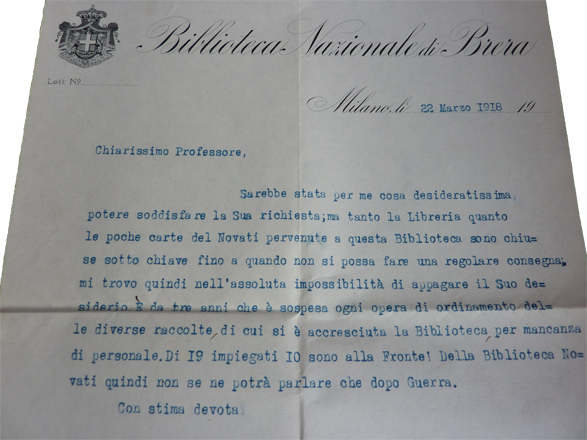 Lettera dattiloscritta del capobibliotecario della Biblioteca Nazionale di Brera (Milano, marzo 1918)