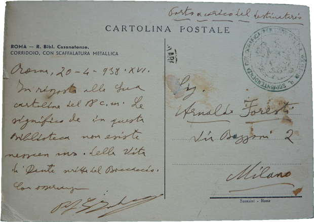 Cartolina della Biblioteca Casanatense in risposta alla richiesta di un manoscritto di Boccaccio (Roma, 1938)