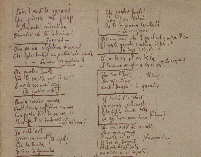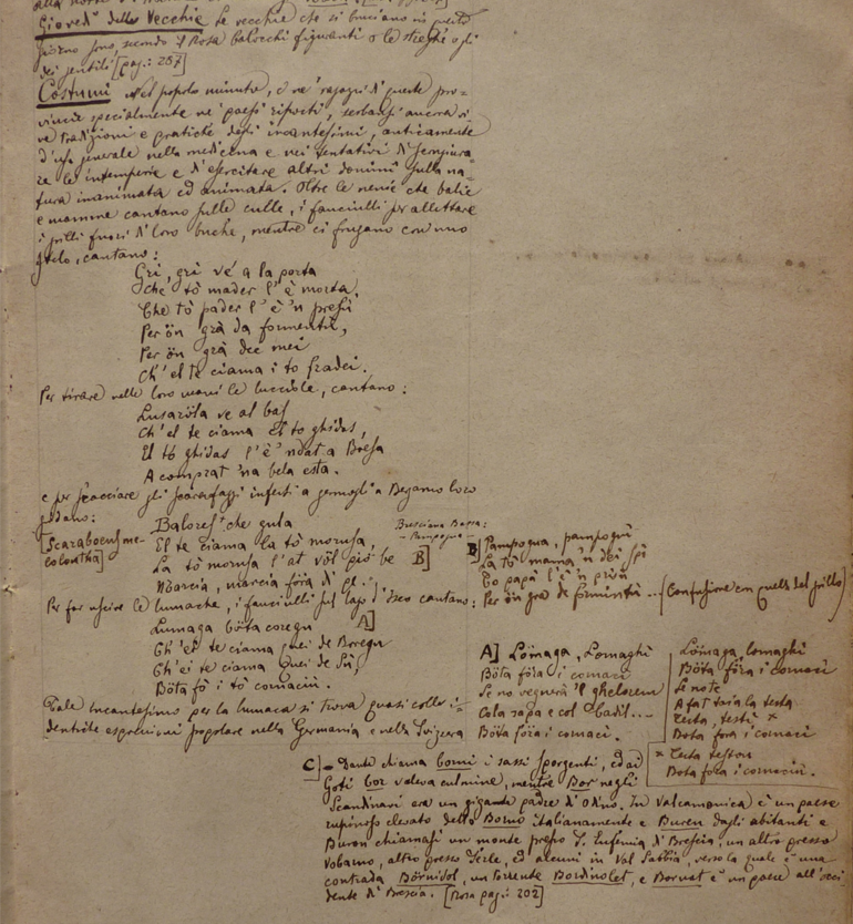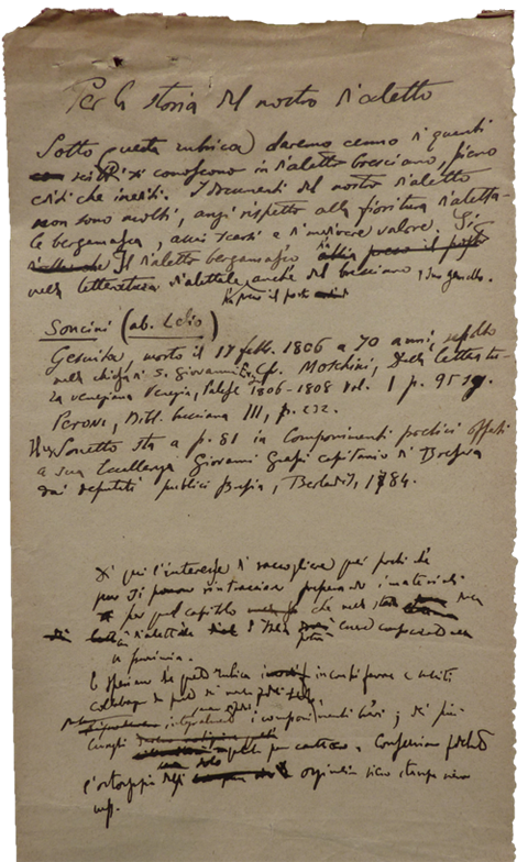 Innumerevoli sono le carte dedicate allo studio del dialetto bresciano. Il progetto iniziale è ambizioso e mira a ricostruire la storia del dialetto informando dei documenti esistenti ma non giunge mai a compimento. Ci rimangono un abbozzo di indice, trascrizioni di poesie, proverbi, appunti e note varie.