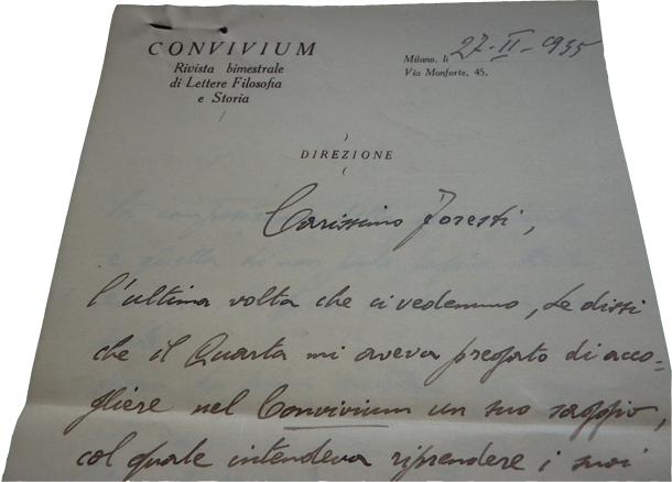 Lettera da Carlo Calcaterra, direttore della rivista Convivium (Milano, 1935)