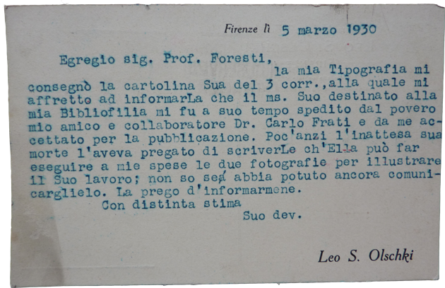 Comunicazione dattiloscritta di Leo Olschki (Firenze, marzo 1930)