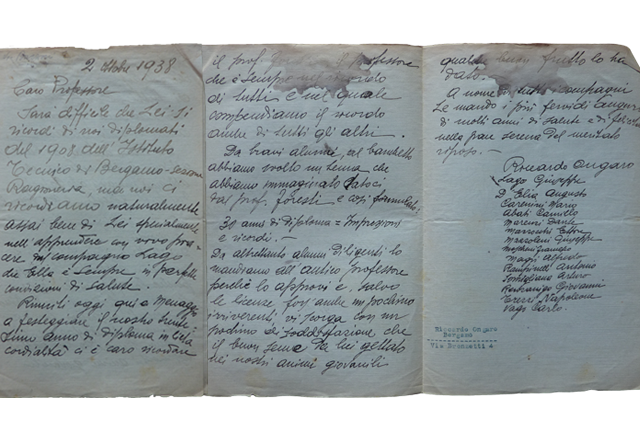 Lettera ricevuta dai diplomati del 1908 dell'Istituto tecnico di Bergamo