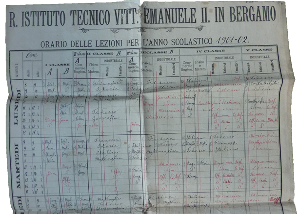 Tabella con orario delle lezioni per l'anno scolastico 1901-02 dell'Istituto Vittorio Emanuele II