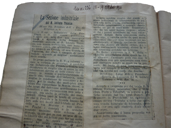 Articolo sulla sezione industriale dell'Istituto tecnico di Bergamo (Eco di Bergamo, ottobre 1910)