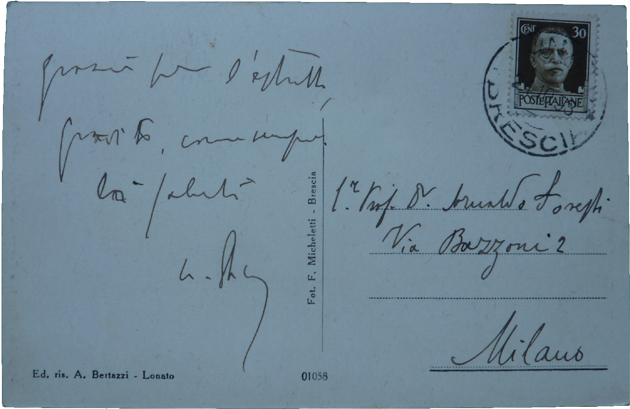 Cartolina ricevuta dall'amico da Como in ringraziamento dell'invio di un estratto delle proprie ricerche