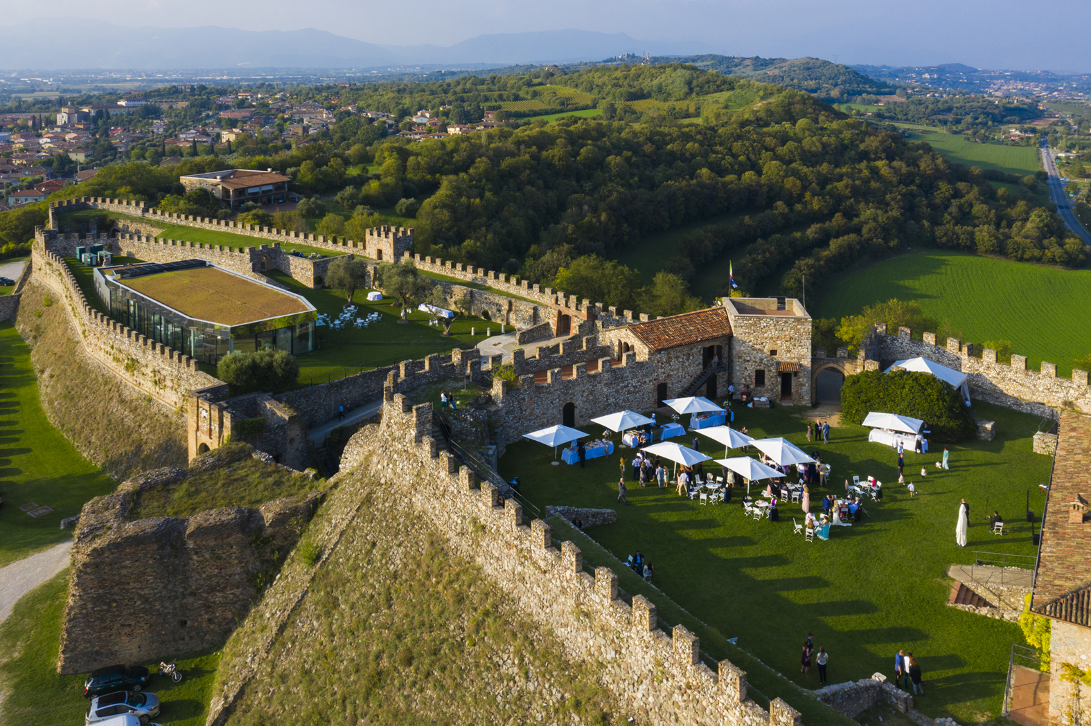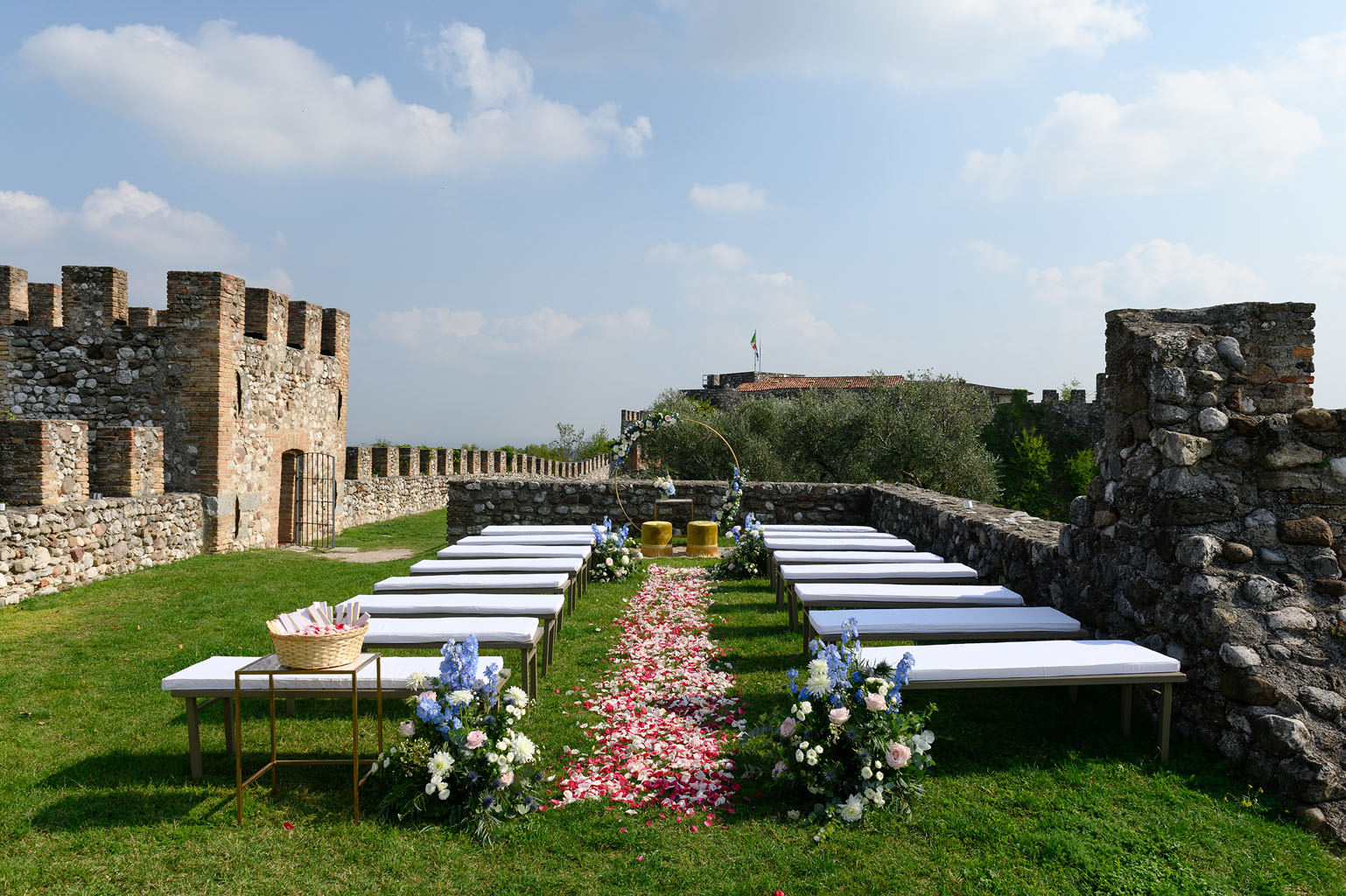 Il quartiere alto della Rocchetta può ospitare la cerimonia oppure l’aperitivo con allestimenti personalizzati e le isole di show cooking curate da Padovani Benuzzi Catering. Passeggiando lungo i camminamenti di ronda, si gode di una meravigliosa vista sul lago e sul borgo antico di Lonato. Dalle terrazze delle due torri di avvistamento il panorama si apre a perdita d’occhio e i colori del cielo, dell’acqua e della pianura lasciano incantati.