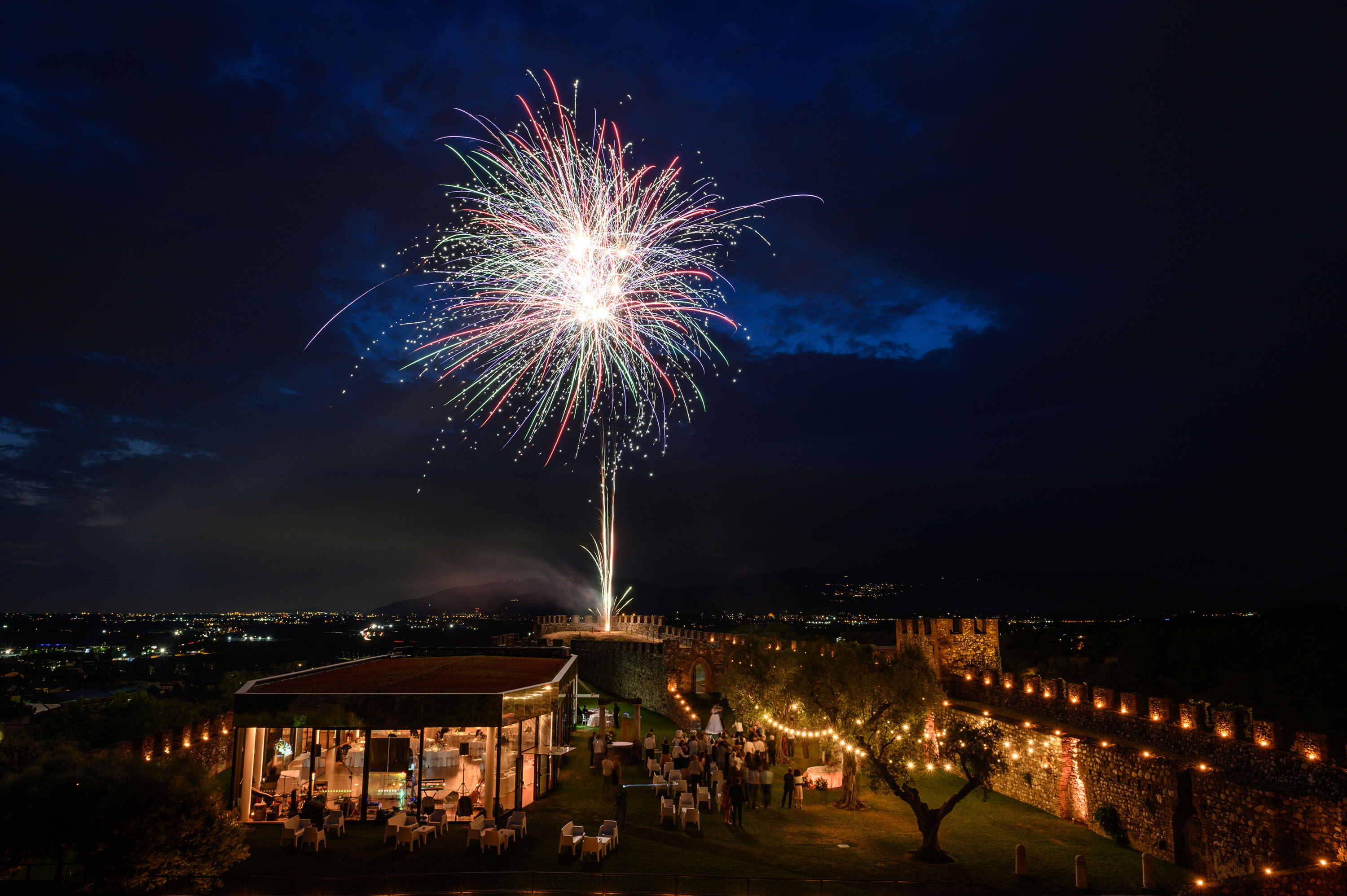 Il salone vetrato si affaccia sul giardino degli ulivi dove è possibile degustare il buffet dei dolci, sorseggiare un cocktail oppure godere di un bellissimo spettacolo fuochi d'artificio che illuminano le mura e il cielo della Rocca.